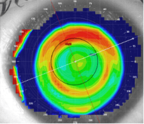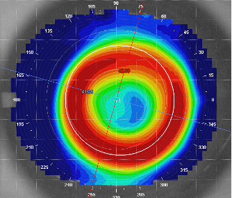 Incomplete reverse curve rings form when a lens fails to align to the peripheral cornea in one meridian. This results in an uneven ring of mid-peripheral steepening, preventing the central fluid pressure from achieving the desired corneal compression. On topography, incomplete reverse curve rings will present as an uneven “bull’s-eye” ring. The reverse curve may be incomplete in only one quadrant (Figure 2) or across an entire meridian (Figure 3).