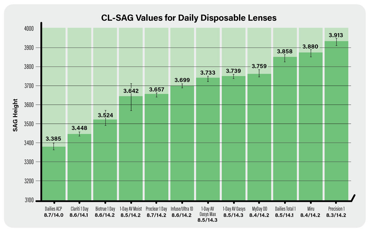 Several studies have looked at soft lens shape,18-20 all measuring lenses in saline at 20° Celsius by International Organization for Standardization (ISO) standards.21 What these studies showed is that there is a wide variety of lens SAGs (CL-SAGs), but it is not unlimited; the major companies cater to the top of the bell curve of normal eyes.