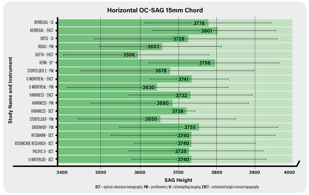 Corneal topographers can now estimate the sagittal height values of the ocular surface (OC-SAG). Figure 1 shows an overview of different studies looking into the average OC-SAG over a 15mm chord measured with several different commercial systems or estimated height calculation by a corneal topographer.2-14 A normal eye over that area would have an OC-SAG of around 3,720 microns on average based on these studies, with a standard deviation of 175 microns. This means that most eyes would be approximately 3,550 to 3,900 microns in height, which would represent 68% of “normal” eyes, but there is some variation based on the instrument used.