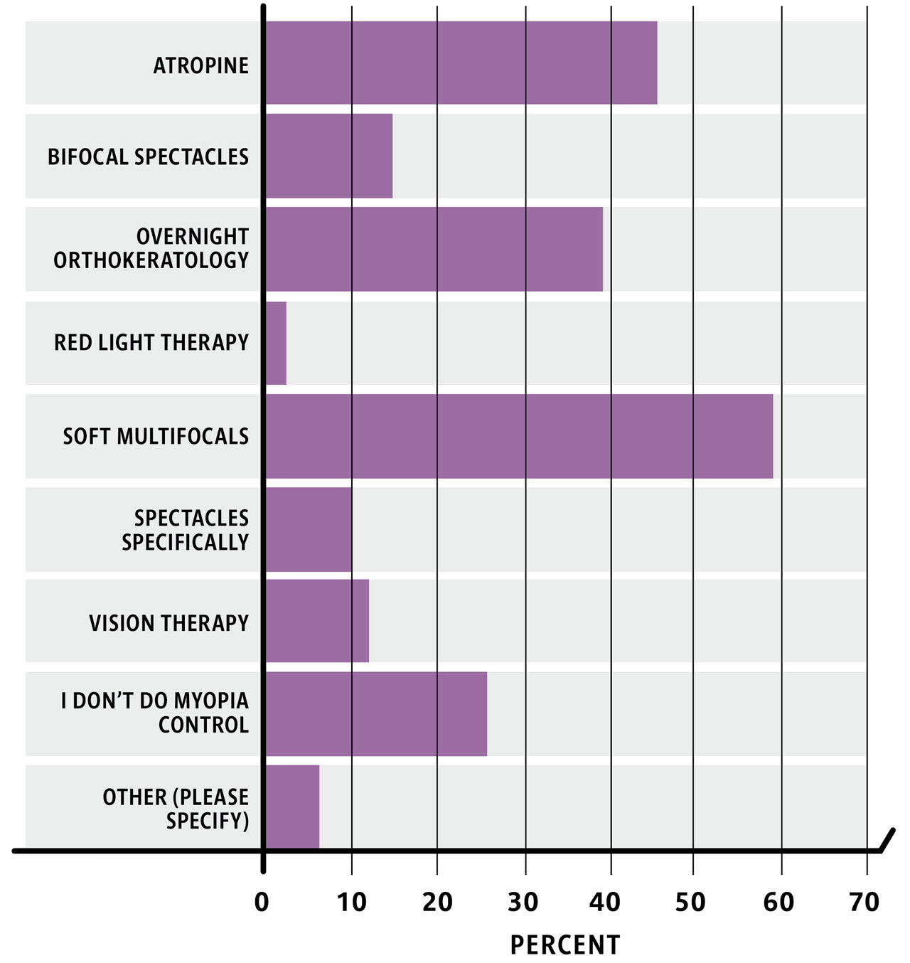 When asked what myopia management options they employ in practice, soft multifocals continue to be the most preferred (58%) but low-dose atropine has increased from approximately 32% one year ago1 to 45% this year (Figure 1).