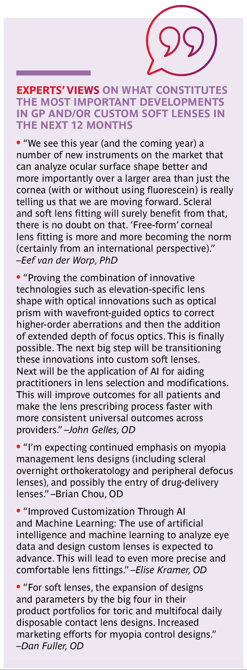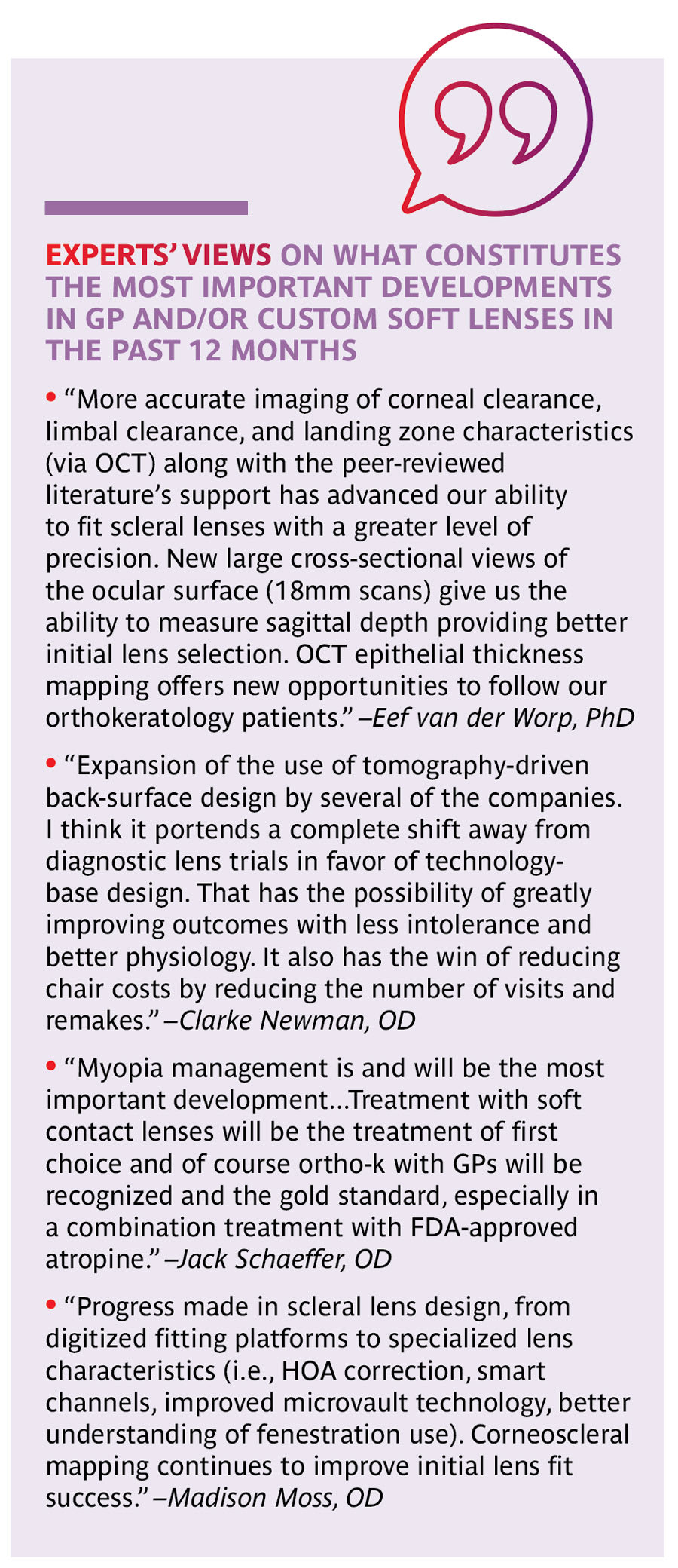 THE GP AND CUSTOM SOFT MARKETS continue to change, notably with an ongoing series of innovations in these specialty designs that can often be life-changing to the wearer. As with previous annual reports, much of the information in this article was obtained by polling the Contact Lens Spectrum (CLS) readership and other experts in the field and exploring recent research.