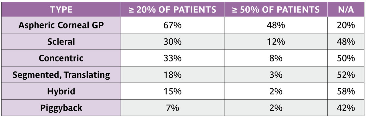 Multifocals The readership survey, as in past years, showed that aspheric multifocal lenses are far and away the most popular GP multifocal design (Table 3). Certainly, a very appealing benefit—although not limited to this design—is the ability to fit them empirically, which typically results in a very good initial visual experience. As scleral lens wearers become increasingly presbyopic, it wouldn’t be surprising to see an increase in this modality.