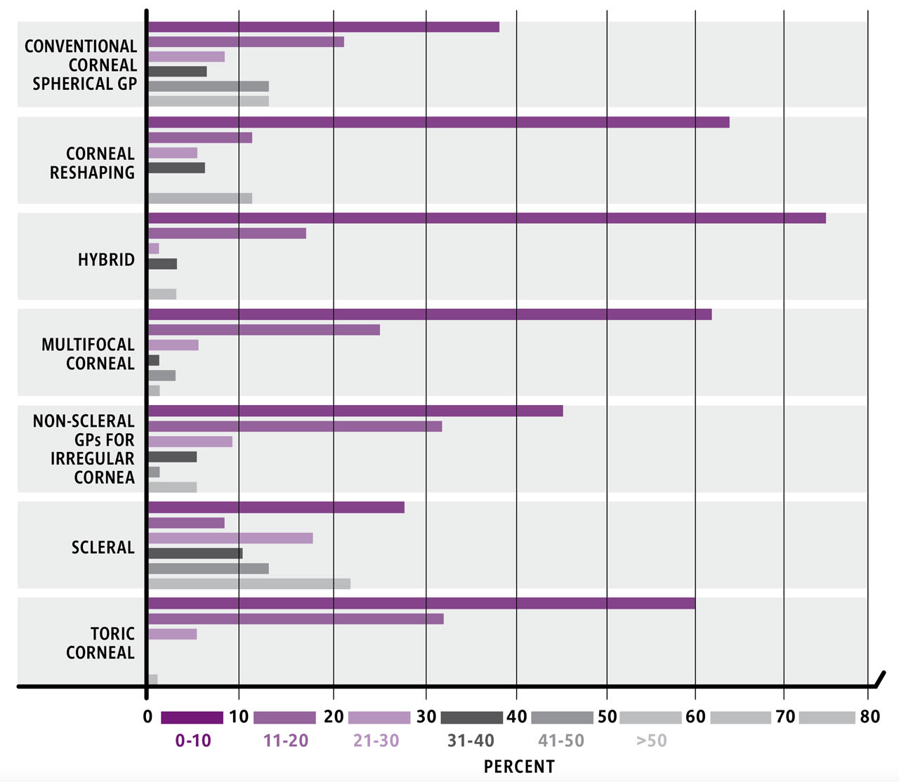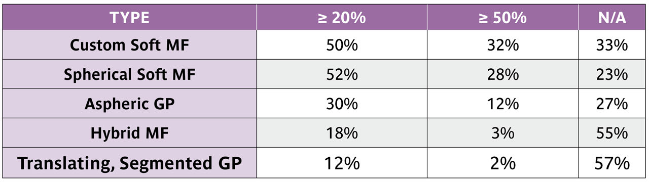 In the past, the second most common go-to lens was small-diameter GP. This year, a higher percentage of respondents fit, at minimum, 50% of their irregular cornea patients into custom soft (13%) versus small-diameter GPs (8%).