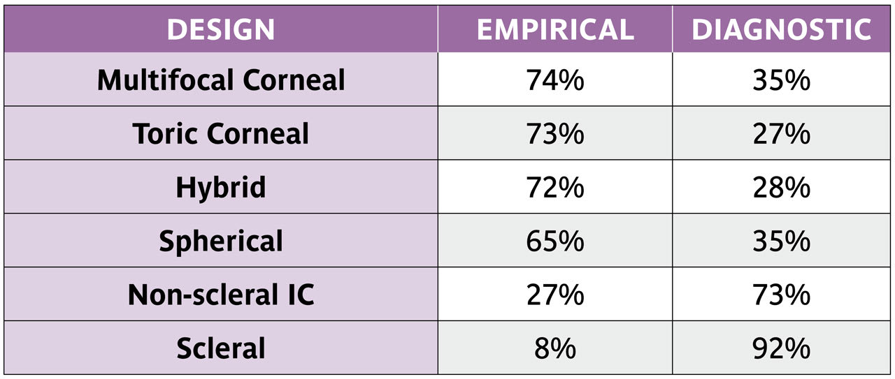 The CLS readership was surveyed as to what percentage of GP lenses they prescribed in several different categories (Figure 2). Another trend is the shift toward empirical fitting in most types of GP lens designs (Table 1). This represents both the necessity of providing good quality of vision upon initial application and the advances in technology in both ocular surface evaluation and lens manufacturing.