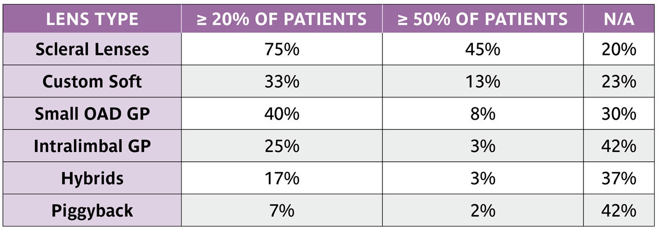 Keratoconus The results of the CLS readership survey about prescribing habits for the contact lens correction of the irregular cornea are shown in Table 2. The two most surprising findings pertain to scleral and custom soft lenses. Scleral lenses have been the “go-to” lenses for many years. However, this year, of the six categories, the highest percentage (80%) of respondents fit sclerals and almost 75% fit, at minimum, one in five of their irregular cornea patients into this modality.
