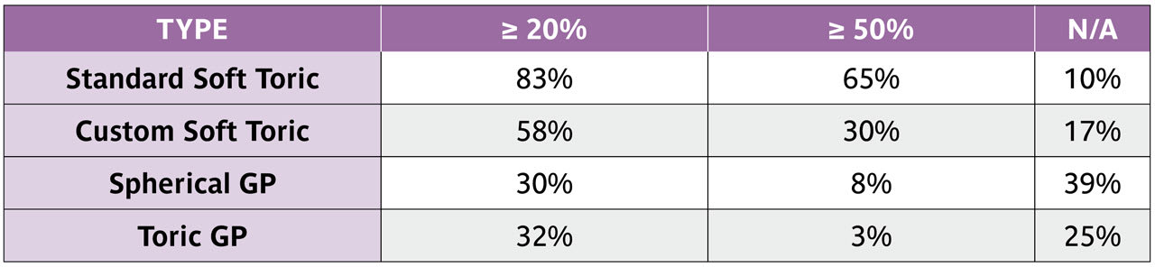 Soft toric lens designs, replacement schedules, and material options also continue to expand. Improvements in lens quality, oxygen transmissibility, and edge designs keep improving as well.31 In the readership survey, when responding to what their contact lens prescribing habits are with patients exhibiting ≥ 2D of refractive cylinder, as in past years, standard soft torics prevailed as the go-to option. However, custom soft torics increased from 22.9% to 30%, and both spherical and toric GP lenses decreased as the preferred option (Table 4).