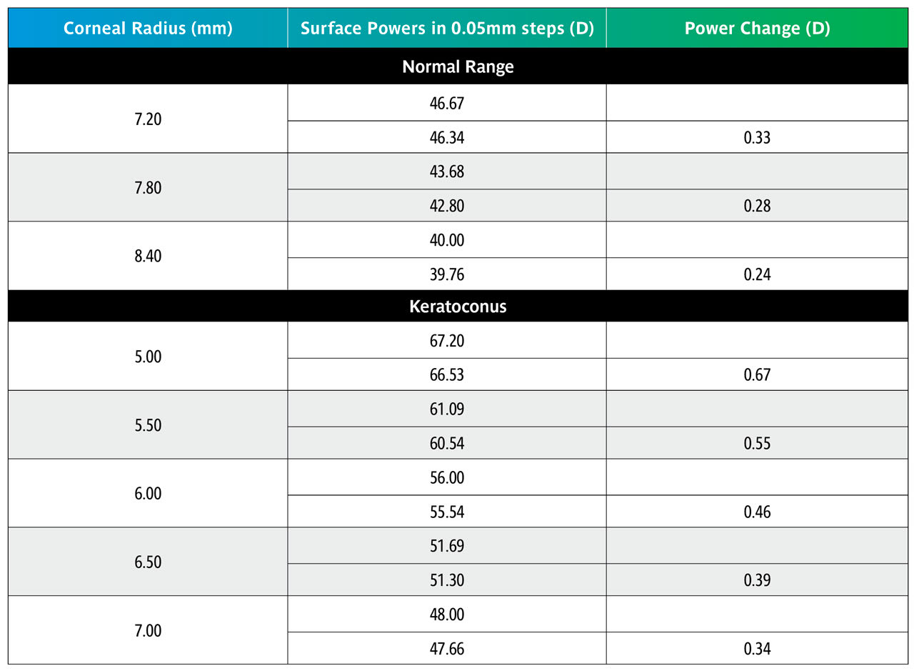 As the BOZR is changed to amend the fit, this changes the shape and, therefore, the power of the liquid tear lens trapped between the cornea and back lens surface. This also requires a compensatory change in the lens power. The change in liquid lens power for BOZR changes of 0.05mm over the normal corneal and keratoconic ranges have, therefore, been calculated and provide a further RoT.