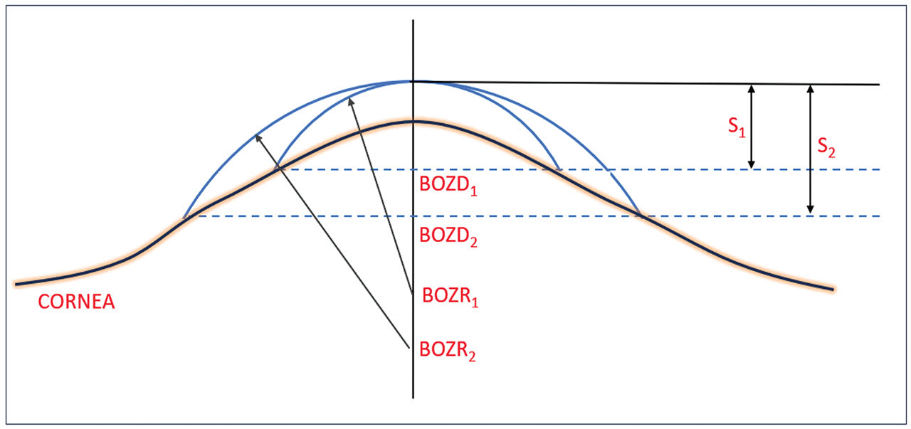 • Increasing the BOZD will require a flatter fit and vice versa. For an average e value, a compensatory change of 0.10mm to 0.15mm in BOZR is required (range 0.05mm to 0.25mm, depending on the e value) for every 0.50mm change in BOZD.