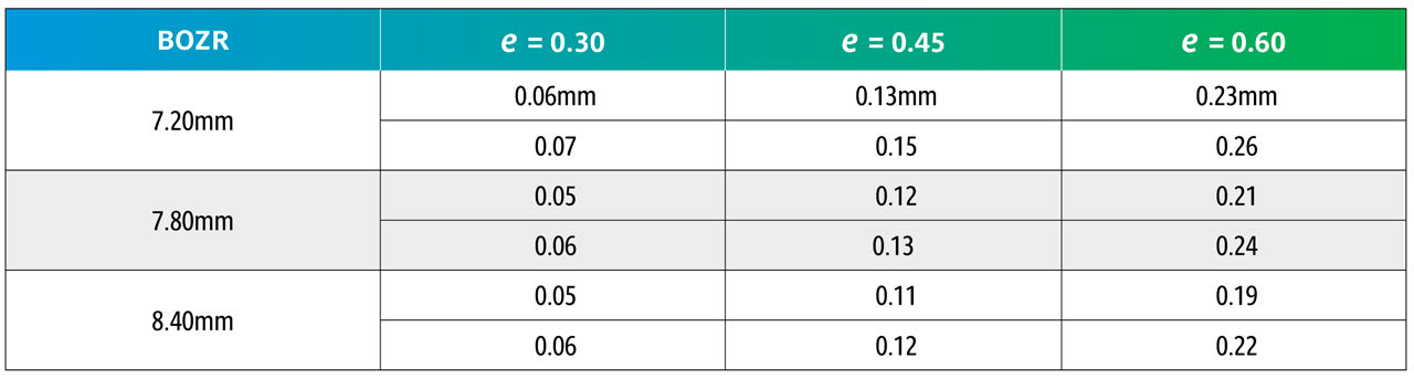 By comparing an original BOZR1 (first column) in one block with the same BOZR1 and e value, but a larger or smaller BOZD, it is possible to obtain the new radii (BOZR2). In Table 5, an example is shown in red for a BOZR of 7.80mm and an e value of 0.45. The original radius selected was 7.80mm with a BOZD of 7.80mm but becomes 7.92mm for a BOZD of 8.30mm.