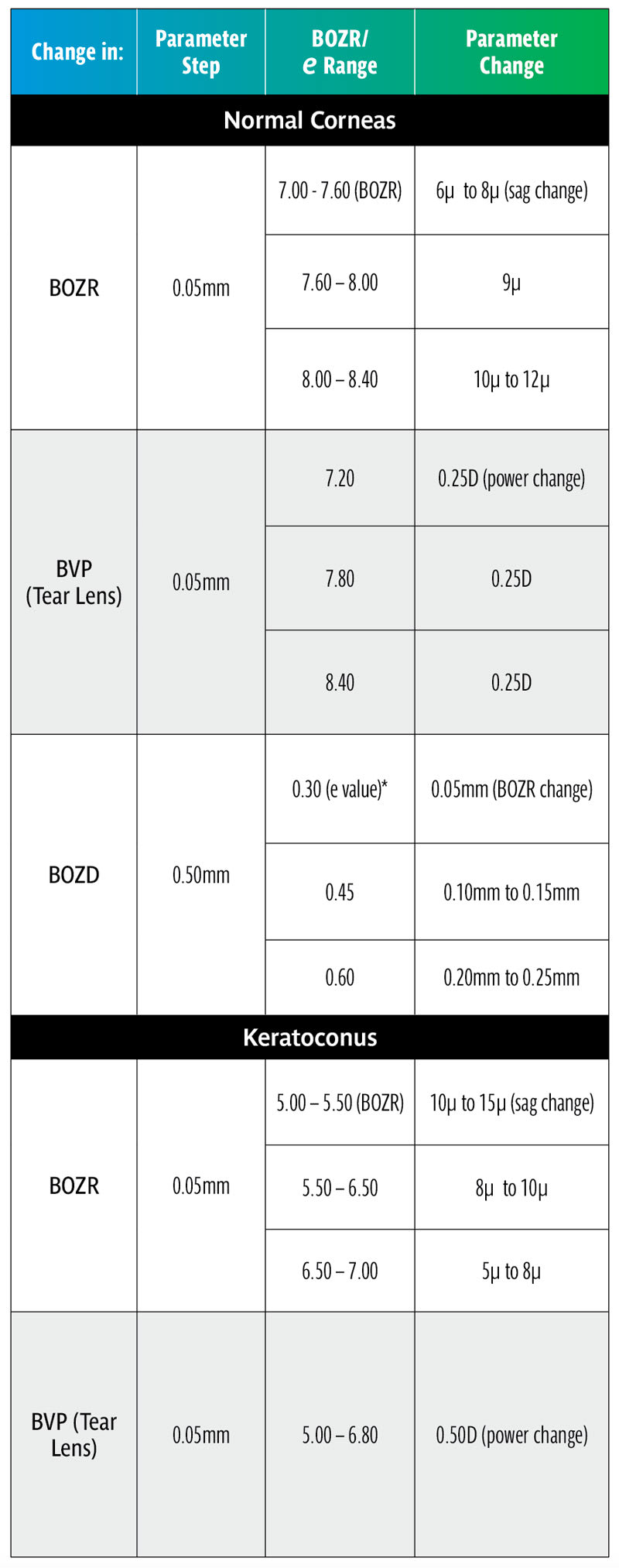 Thus, increasing or decreasing the BOZD by 0.50mm requires a change in BOZR of approximately 0.05mm for low corneal eccentricity values, 0.10mm to 0.15mm for midrange e values, and 0.20mm to 0.25mm for steep corneal eccentricities. This then provides a guide when selecting a new trial lens with a different BOZD (and logically an equally larger or smaller TD trial lens).