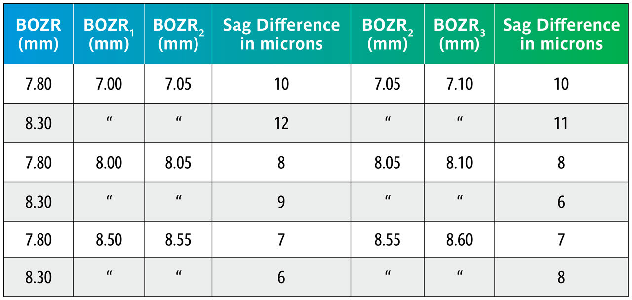 The data in Table 2 shows that varying the BOZR by 0.05mm steps changes the central lens sag by 6µ to 12µ with an average of 9µ.