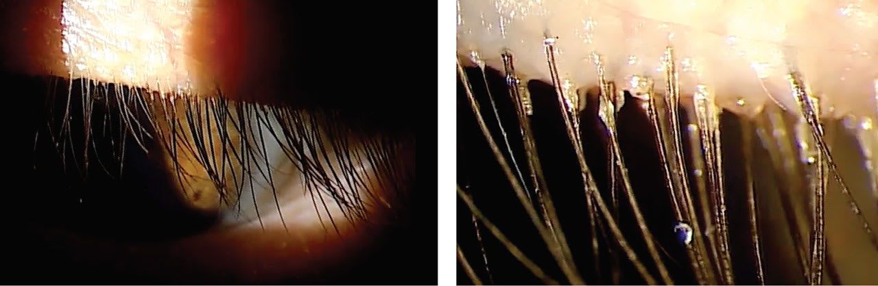 An example of this is assessing the base of the lashes at a patient’s lid margin. At a low magnification, the collarettes may seem insignificant. Viewing the same lid margin at a high magnification makes it easier to see the collarettes that are present (Figure 1).