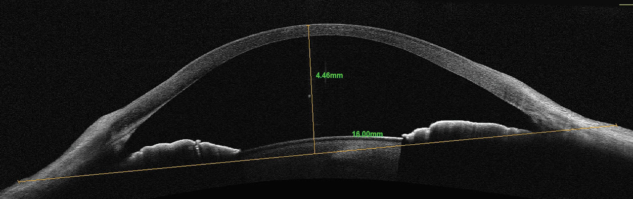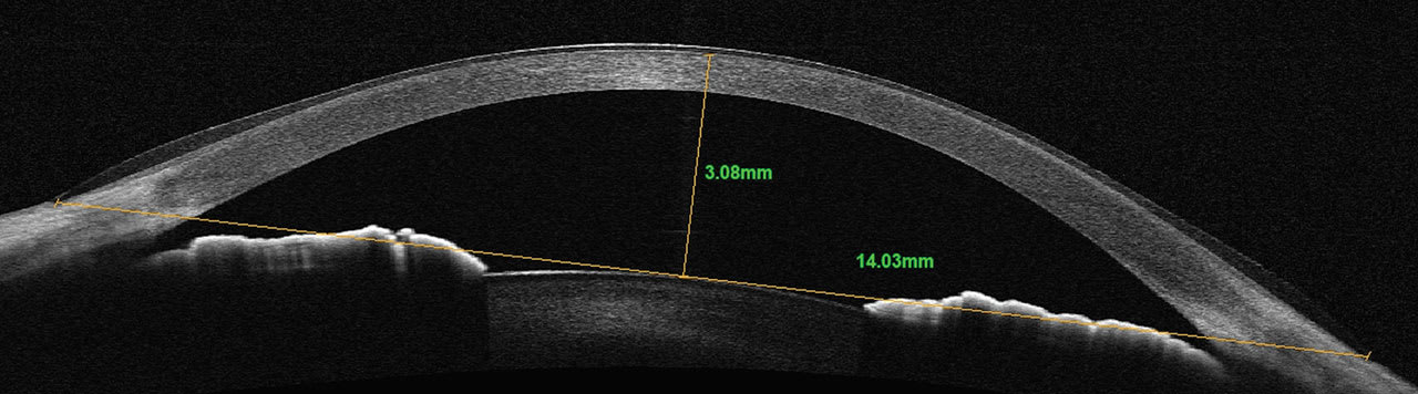 Newer OCT technologies allow for larger horizontal cross-sectional scans of the cornea and anterior segment. It provides the ability to better select the initial diameter of a scleral lens based upon the horizontal visible iris diameter (HVID). Sagittal depth can be measured from the surface of the cornea to any chord length or width of the scan acquired.