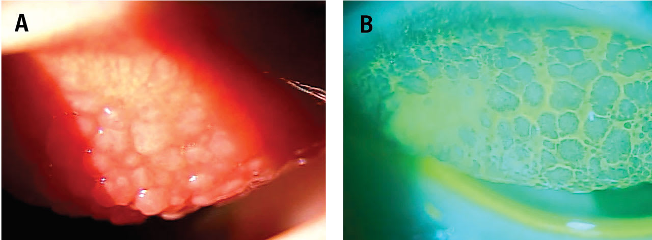 Where fluorescein pools, there will be hypofluorescence. Examples of this include conjunctival and corneal staining, accumulation of fluorescein around the base of papillae present on the palpebral conjunctival surface (Figure 2), and accumulation in regions of conjunctivochalasis, between folds of the conjunctiva.1 Fluorescein can also be observed in regions of the eye exposed to excessive friction, such as in the presence of lid wiper epitheliopathy.2