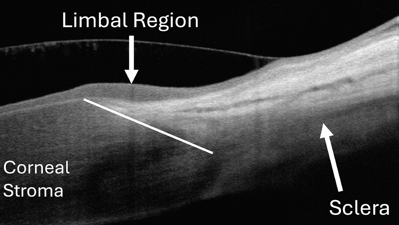 Limbal clearance is critical when fitting scleral lenses to avoid excessive pressure on the limbal stem cells. After the scleral lens is applied to the eye, OCT allows the practitioner to view the limbal region to assure clearance. On the OCT scan, there are several landmarks that help identify this region.