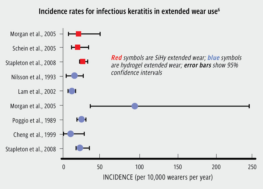 There is limited evidence of the incidence rate of infectious keratitis beyond that of early-generation lenses, but we see similar incidence rates in wearers of extended-wear SiHy and hydrogel lenses—1 in 400 per year5,6 (Figure 3). Material type appears to have no impact in 2 more recent case control studies,7,8 and SiHy lens wearers have a microbial profile9 and rate of vision loss5 from infectious keratitis similar to those of hydrogel contact lens wearers. A recent Cochrane review has concluded that there is no evidence that specific materials affect the rate of vision-threatening disease.10 There is limited evidence that the materials in cosmetic or decorative lenses cause corneal infections, noting the overrepresentation of hydrogel materials for these applications in Asia.11