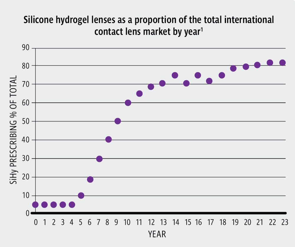 SILICONE HYDROGEL (SiHy) materials were commercialized 25 years ago and now account for almost 80% of all new lenses fitted internationally. This article will discuss the pros and cons of SiHy contact lenses for refractive indications, including the effects on complications of wear. It also will review how these characteristics inform contemporary specialty contact lens practice, discuss new indications for wear, and offer suggestions for how to optimize wearer outcomes.