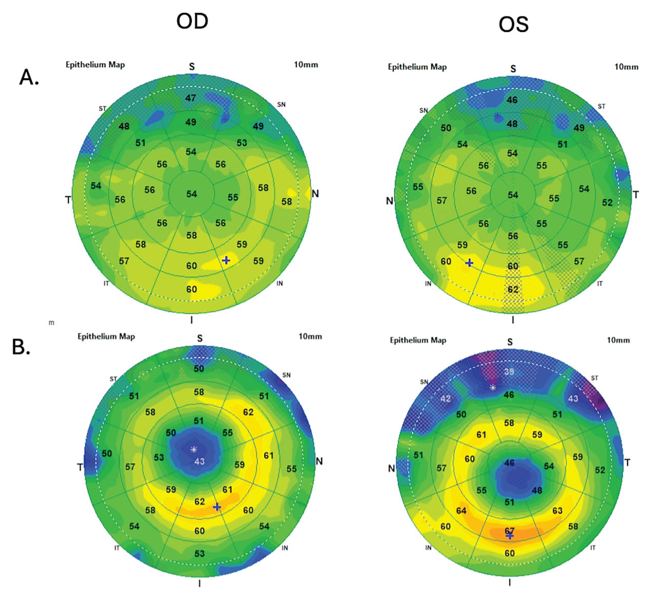 The pre- and posttreatment epithelial thickness maps are shown in Figure 1. The right eye demonstrated appropriate alignment, but the treatment zone manifested in the left eye showed epithelial thinning inferiorly. The landing zone of the left eye was slightly loosened, which helped with the vertical positioning of the treatment zone.