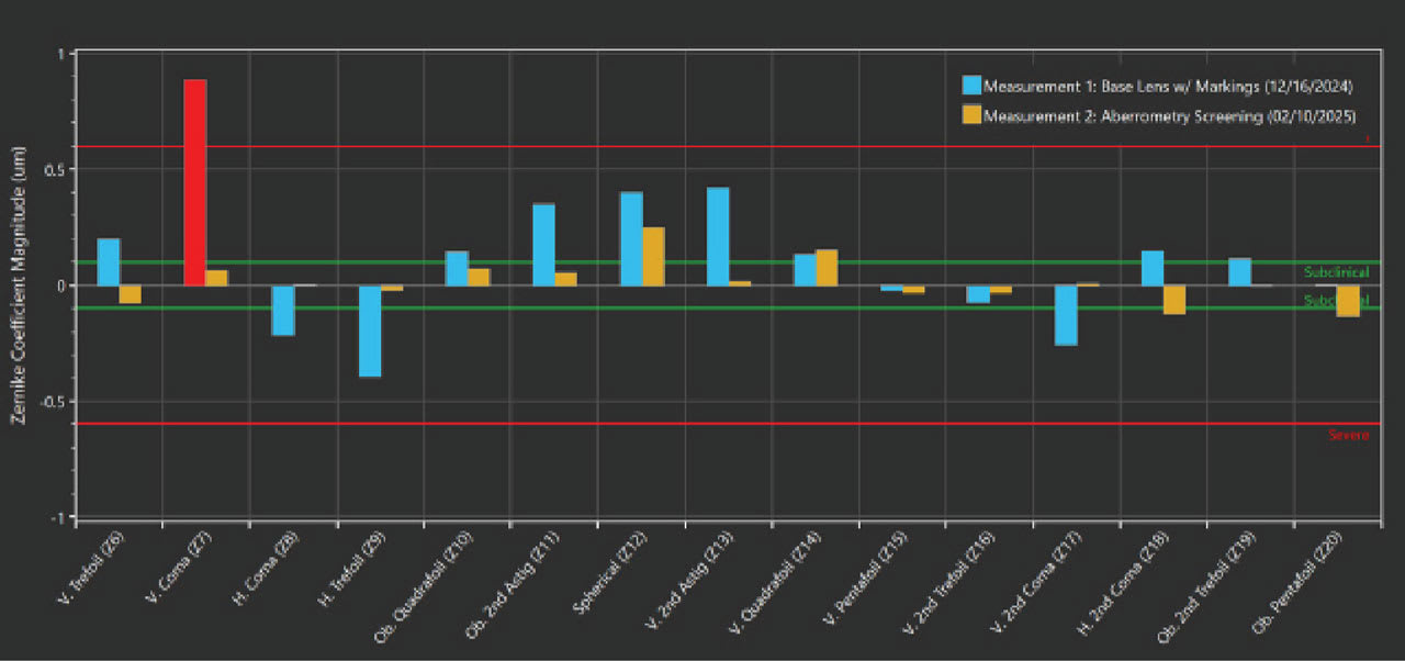 Scleral lenses were redesigned with a front-surface eccentricity value of –0.6. It has been demonstrated that front-surface eccentricity can reduce residual HOAs, including coma (Hussoin et al, 2025). The dispensation of those lenses resulted in visual acuities of 20/60 OD and 20/100 OS. Overaberrometry measurements showed no reduction in positive vertical coma, which is one of the most debilitating HOAs.