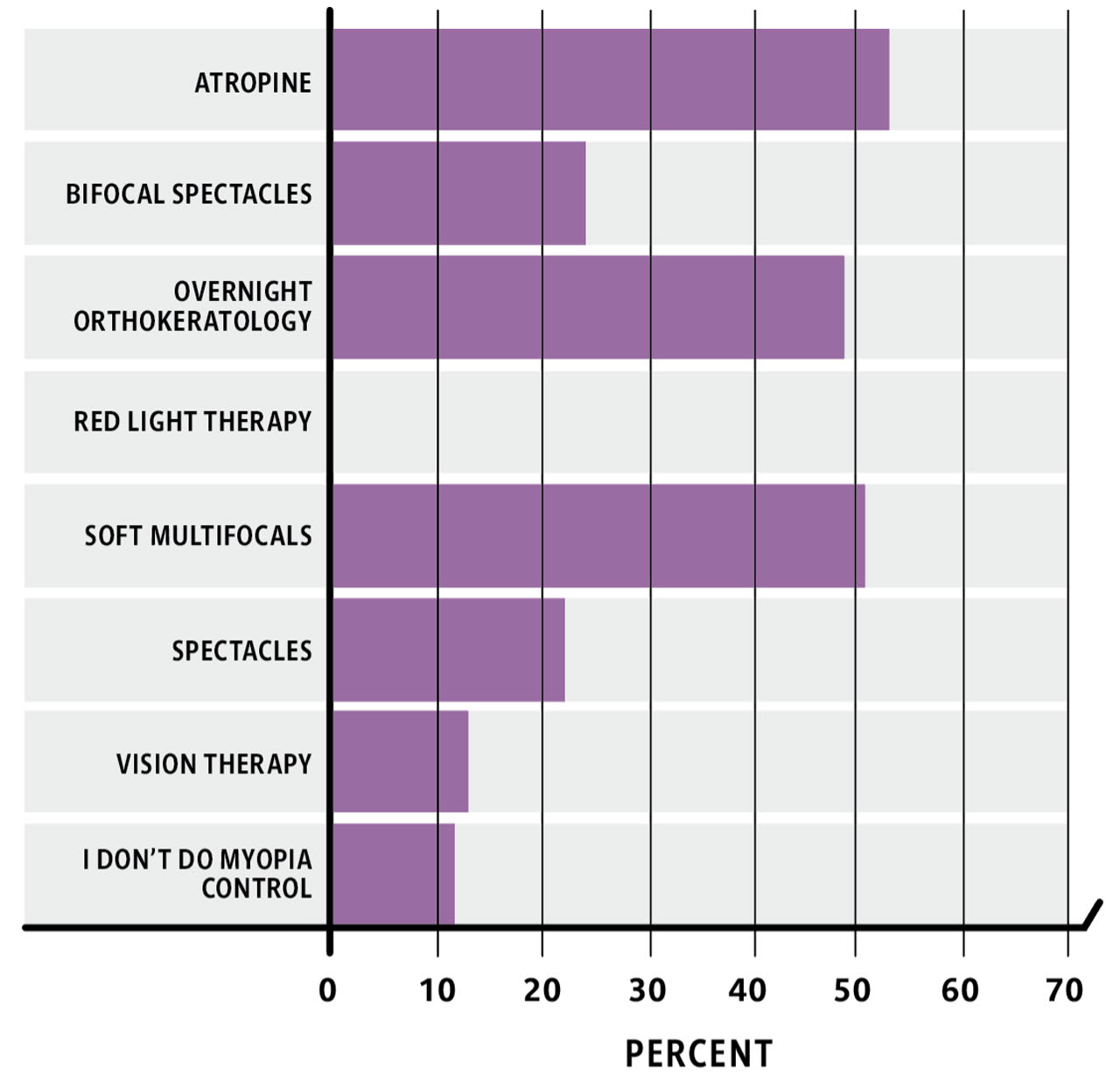 The CLS reader survey posed questions about myopia control treatments used in practice (Figure 3). Of the respondents, 27% said they did not do myopia control. Low-dose atropine was used by the highest percentage of practitioners (53%), followed closely by myopia control soft multifocals (51%) and orthokeratology lenses (49%). Despite the lack of availability of myopia control spectacles in the United States other than sites participating in clinical trials, 22% of those participating in the study reported using these glasses in their practices. This finding may highlight the international readership of CLS.