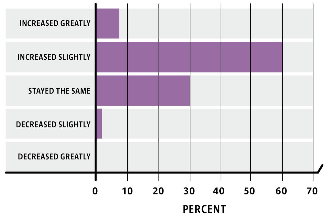 Further evidence of the increase in scleral lens fitting is evident in the CLS reader survey. Sixty-seven percent of respondents reported that scleral lens use had increased in their own practices over the last 12 months (Figure 2). These findings further align with the growth in scleral lens preference found in previous studies examining the practice habits of scleral lens practitioners. In those studies, practitioners who regularly fit scleral lenses preferred fitting corneal GP lenses for corneal irregularity in 2015,5 compared to a greater preference for scleral lenses for the same condition in 2020.6
