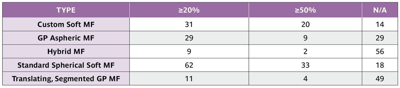 Of course, patients who wear GP and specialty lenses deserve to see near objects clearly when presbyopia occurs, too. Table 5 shows the percentage of lens types being fit for multifocal correction of presbyopia. Thankfully, wearers of GP lenses can be easily transitioned into lenses that correct vision at multiple distances. Laboratories have numerous lens designs available to incorporate add power into lenses.