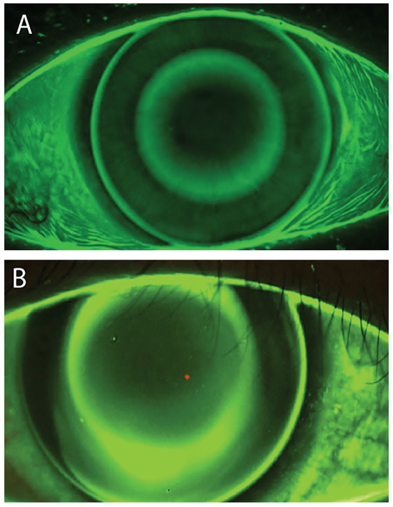Figure 1A shows an even alignment zone 360° around the center bull’s-eye, whereas Figure 1B shows NaFl bleeding into the inferior quadrant of the alignment zone. The lack of a defined bull’s-eye due to a poor fitting alignment curve can negatively impact the forces that encourage epithelial cell migration. This can lead to decreased acuity or residual refractive error. Similar to scleral lens fitting, adding toric or quadrant-custom peripheral curves can improve the outcome of this process.