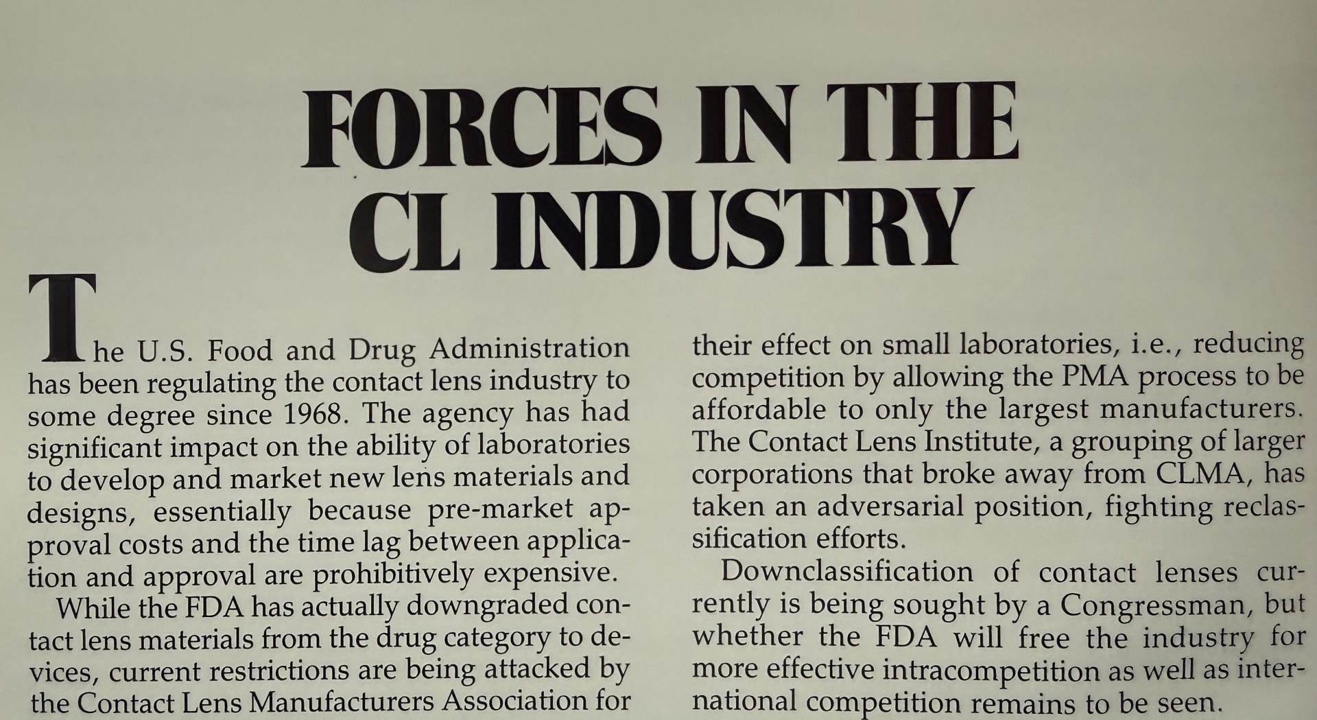 At the beginning of each month this year, we look back (or look forward) as we celebrate the 40th Anniversary of Contact Lens Spectrum. This month, we consider the regulation of contact lenses. Going back in time (see article below from the Contact Lens Centennial published in 1987), the US Food and Drug Administration (FDA) began regulating soft contact lenses in the late 1960s. Fast forward to present day, we now have a 2-agency regulatory framework that includes the FDA and Federal Trade Commission. Seen through the lens of several decades, this regulatory journey highlights the dynamic interplay between policy and patient care that continues to shape our profession.