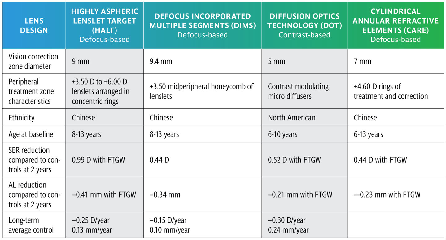 Similar to contact lens modalities, spectacles offer vision correction within a central optical zone for optimal distance visual acuity. Simultaneously, the devices alter the peripheral retinal image through defocus-based mechanisms (Table 2).