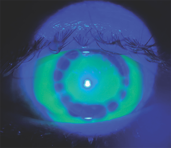 The patient’s hesitation was immediately relieved upon application of the lens. He reported no feeling of pain or discomfort and obtained 20/20 OD after the lens settled. Unfortunately, there was some lens bearing at the elevated suture location with the first fit (Figure 1).