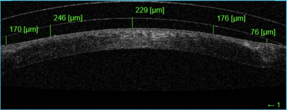 Subsequently, in 2022 he had a successful penetrating keratoplasty (PKP) procedure, which provided a smooth but oblate central cornea surface with irregularity at the intersection of the graft/host area. At that time, he was able to achieve 20/70 OD with a -15.00D corneal contact lens.