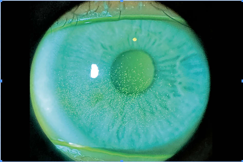 A 26-year-old Hispanic male was referred to our office for a scleral lens fitting. The case notes from the referral center showed a history of mild meibomian gland dysfunction (MGD), diffuse punctate epithelial erosions (PEE), and mild filamentary keratitis (Figure 1). The patient did not have any diagnosed systemic issues, but reported days of significant joint aches and pains that wax and wane. The referral center was starting on bloodwork to determine possible etiologies.