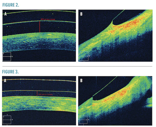 Another OCT image was obtained upon dispensing of the lens (Figure 3a-b). Central clearance after 20 minutes of settling revealed a clearance of 188 microns. The relationship of the peripheral curves to the globe were much improved. Visual acuity of the right eye was 20/20 with no over-refraction. Upon completion of training with staff regarding proper insertion, removal, and lens care, the patient was released for follow-up care. Several years later, the patient continues to report improvement in subjective symptoms and overall vision.
