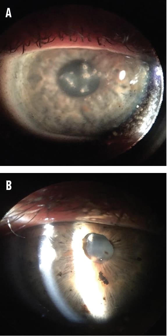 A 46-year-old male presented to the clinic following a black powder explosion at home. The result of the explosion resulted in numerous metallic fragments embedded through the cornea and iris of each eye (Figure 1 a-b). Following careful monitoring for further inflammatory events by a tertiary referral center, the patient was referred for a specialty contact lens fit to see if his vision could be further improved. His chief complaint centered around debilitating glare and halos that worsen with night driving.