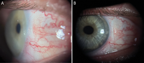 The initial fitting process required 3 sets of lenses for each eye to optimize vision and comfort. The final OD lens was designed at 16.0 mm diameter with 125 µm of limbal vault to address limbal microcystic edema seen with the first lens design. Quadrant-specific haptics ensured centration, and a front surface toric correction resolved residual lenticular astigmatism. A similar design was used for the OS lens, yielding 20/20 vision and full-day comfort.