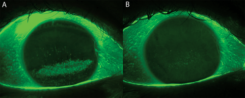 Visual acuity with eyeglasses was 20/25 OD and OS. Slit lamp examination with vital dyes revealed exposure keratopathy and trace perilimbal conjunctival dryness OD and OS. Corneal sensitivity was reduced OD and OS, and she denied ocular pain. Corneal topography revealed inferior steepening OU with K readings of 44.80/47.89@090 OD and 44.90/47.52@073 OS. Pachymetry showed localized thinning with a minimum corneal thickness of 459 µm OD and 469 µm OS.