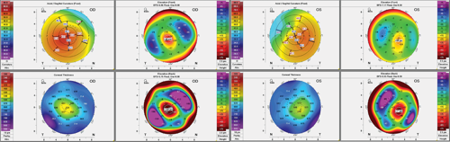 The patient’s keratometry was 58.40/53.62@063 OD and 48.59/45.64@042 OS. The horizontal visible iris diameter (HVID) was 12.0 mm in each eye. Manifest refraction was +0.50 -3.75 x 075 OD and -0.25 -2.75 x 155 OS with a best- corrected visual acuity (BCVA) of 20/125 OD and 20/30 OS with a +1.00DS add for near visual acuity (VA) of 20/25. Entrance pupil testing was within normal limits. Slit lamp biomicroscopy showed a papillary response on the palpebral conjunctiva and apical corneal thinning OD and OS with no scarring. Corneal topography confirmed a diagnosis of severe keratoconus OD and moderate keratoconus OS. Intraocular pressure (IOP) was 14 mmHg in each eye. Dilated fundoscopy was unremarkable.